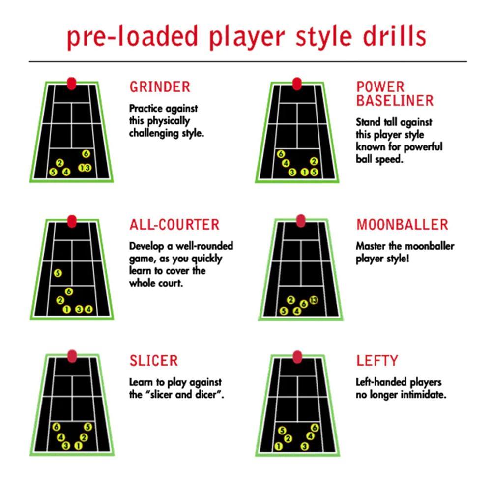 • Pre-loaded drills: power baseliner, all-courter, grinder, moonballer, slicer, lefty